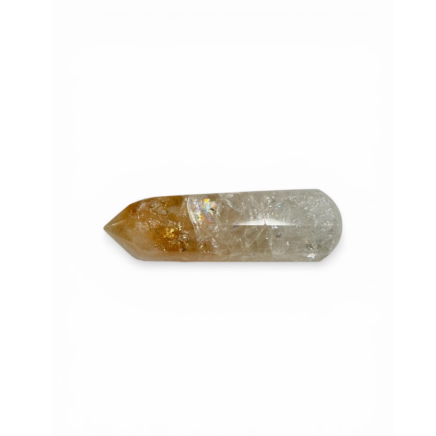 One of the most visually striking citrine points you'll find — this tower transitions from a richly saturated amber-gold tip into a brilliantly clear quartz base, creating a natural two-tone gradient that looks almost painted by hand. At the midpoint where the two zones meet, rainbow flashes of iridescent light dance inside the crystal, shifting with every movement.