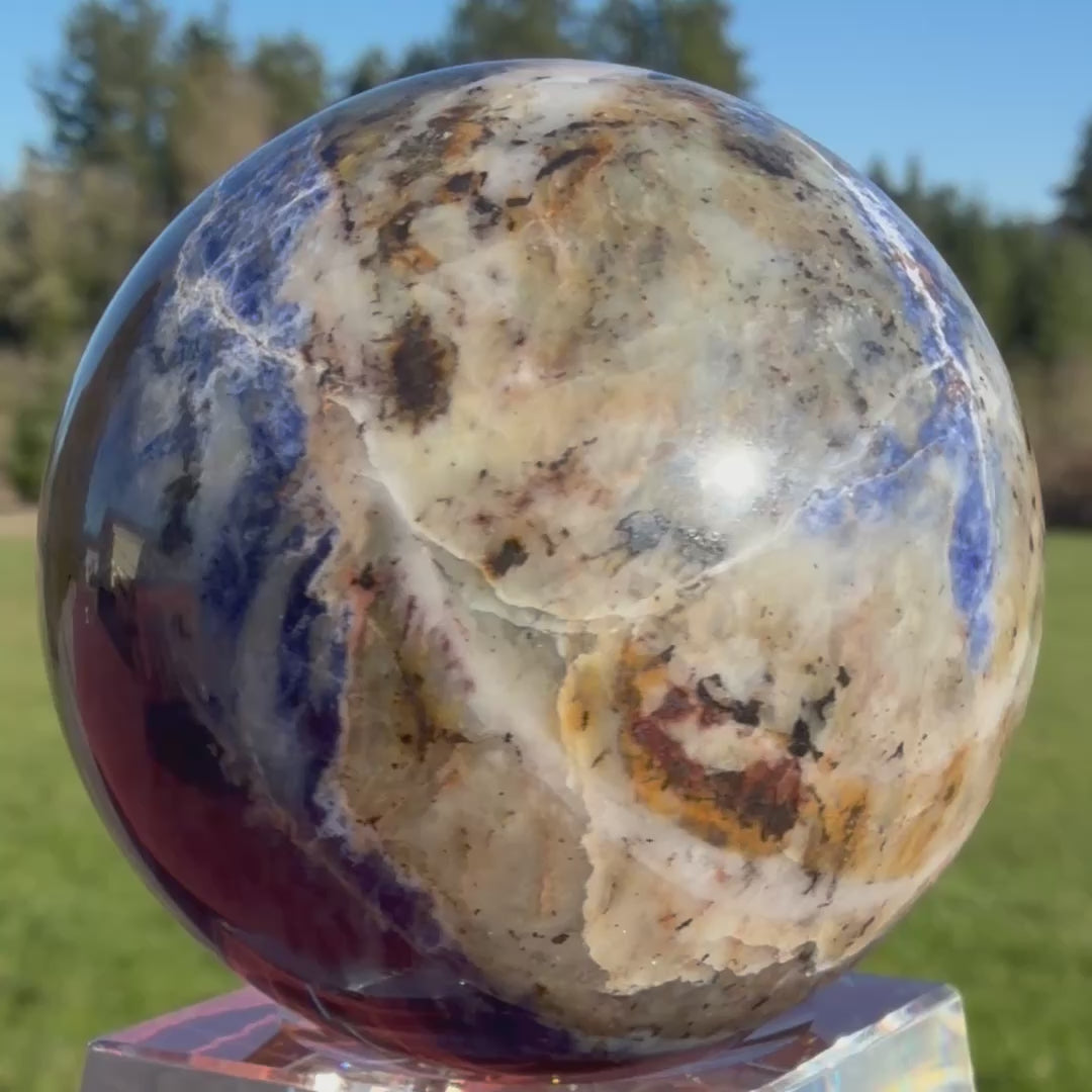 Hold a miniature planet in the palm of your hand. This striking Sodalite sphere captivates with its deep, royal blue hues interlaced with creamy white calcite and unique earthy orange inclusions. Looking at it feels like gazing at a satellite view of the Earth—oceans, clouds, and landmasses swirling together in harmony.