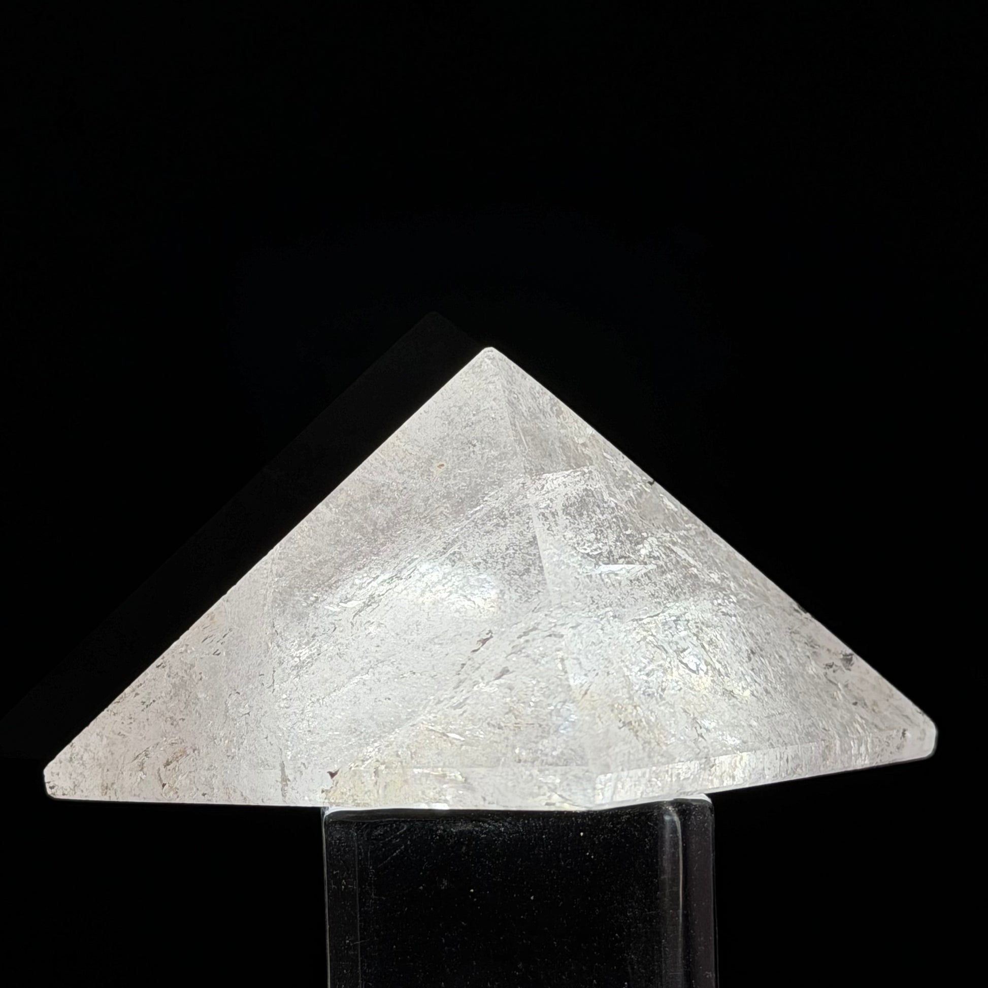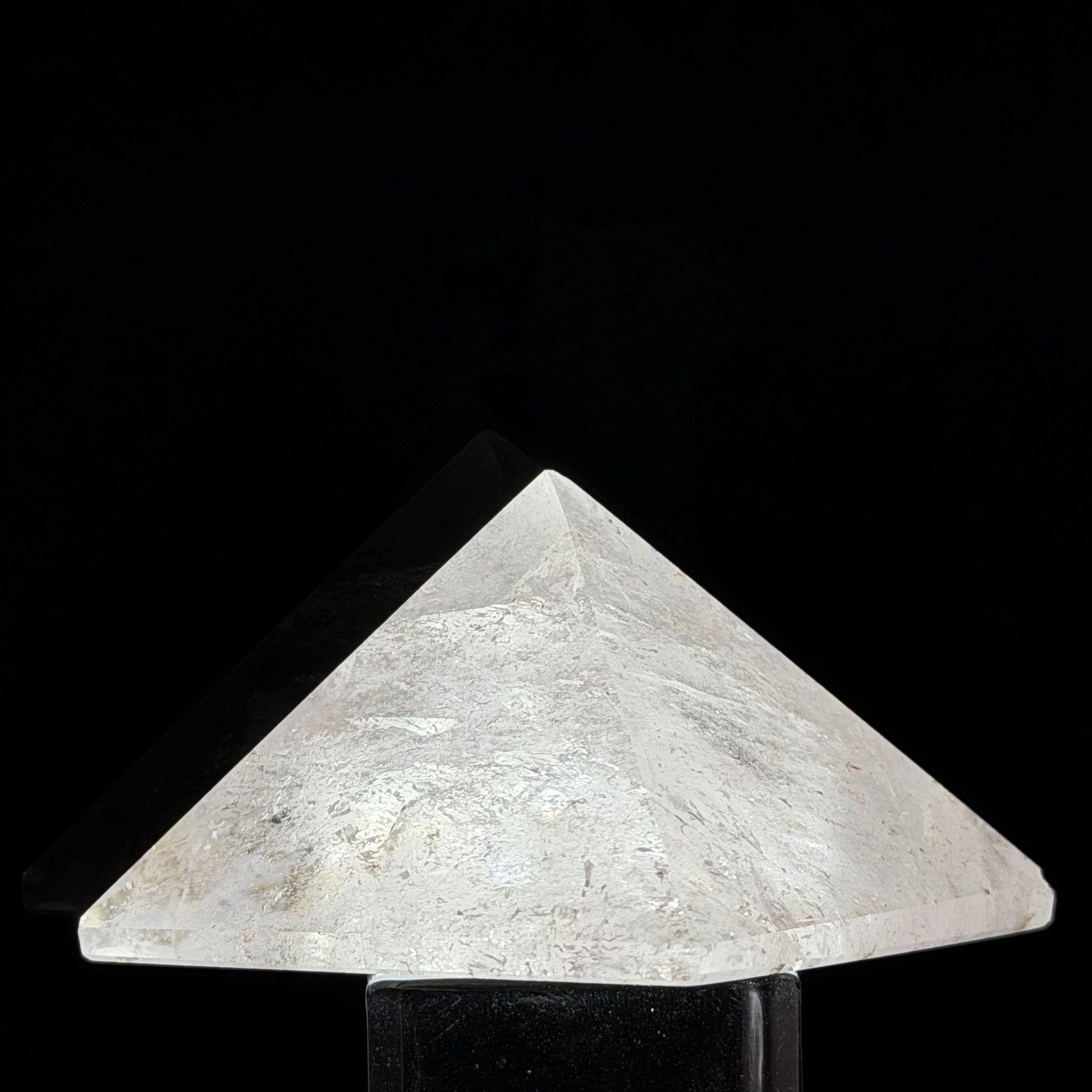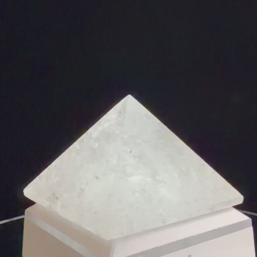 This Clear Quartz Pyramid boasts extraordinary transparency and a radiant glow that emanates from within. As a symbol of Sacred Geometry, the pyramid shape is believed to draw in surrounding energy through its base and release it with concentrated power through its apex.