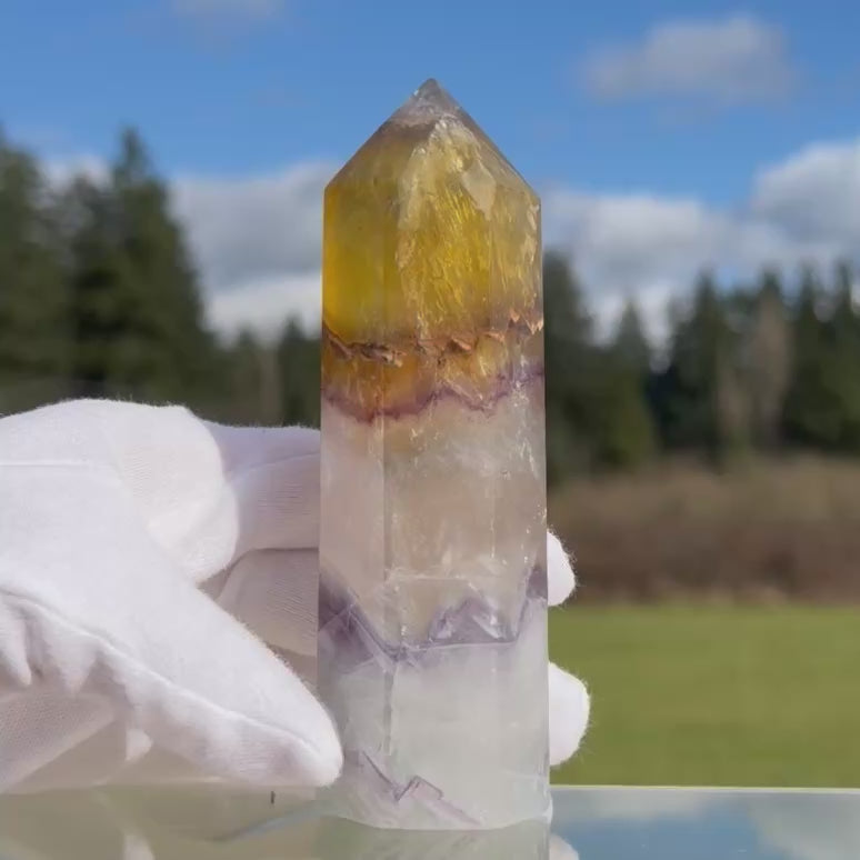 Illuminate your space with the radiant energy of this rare Golden Fluorite Tower. The top of this crystal glows with a vibrant, honey-like yellow, reminiscent of the morning sun. As your eyes move down, you'll discover a breathtaking "Rainbow Iris" shimmering within the heart of the stone, casting multi-colored light with every turn.