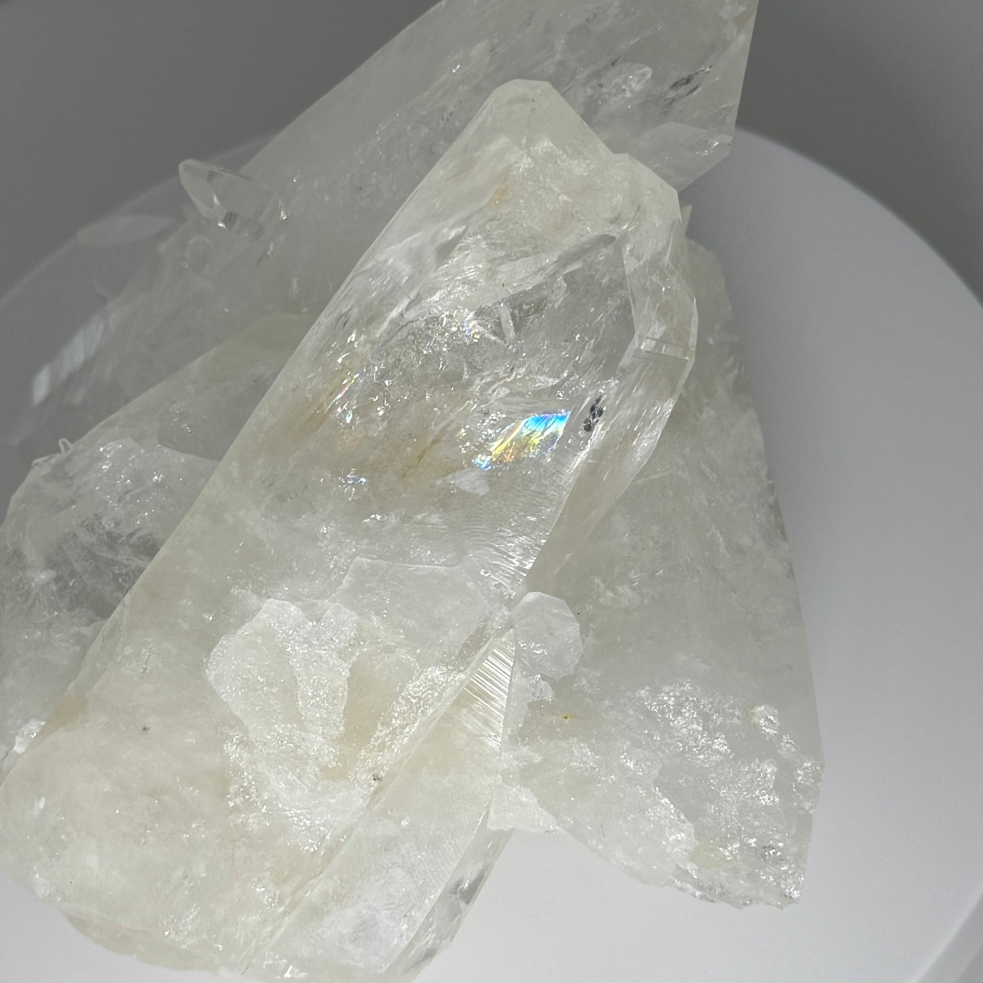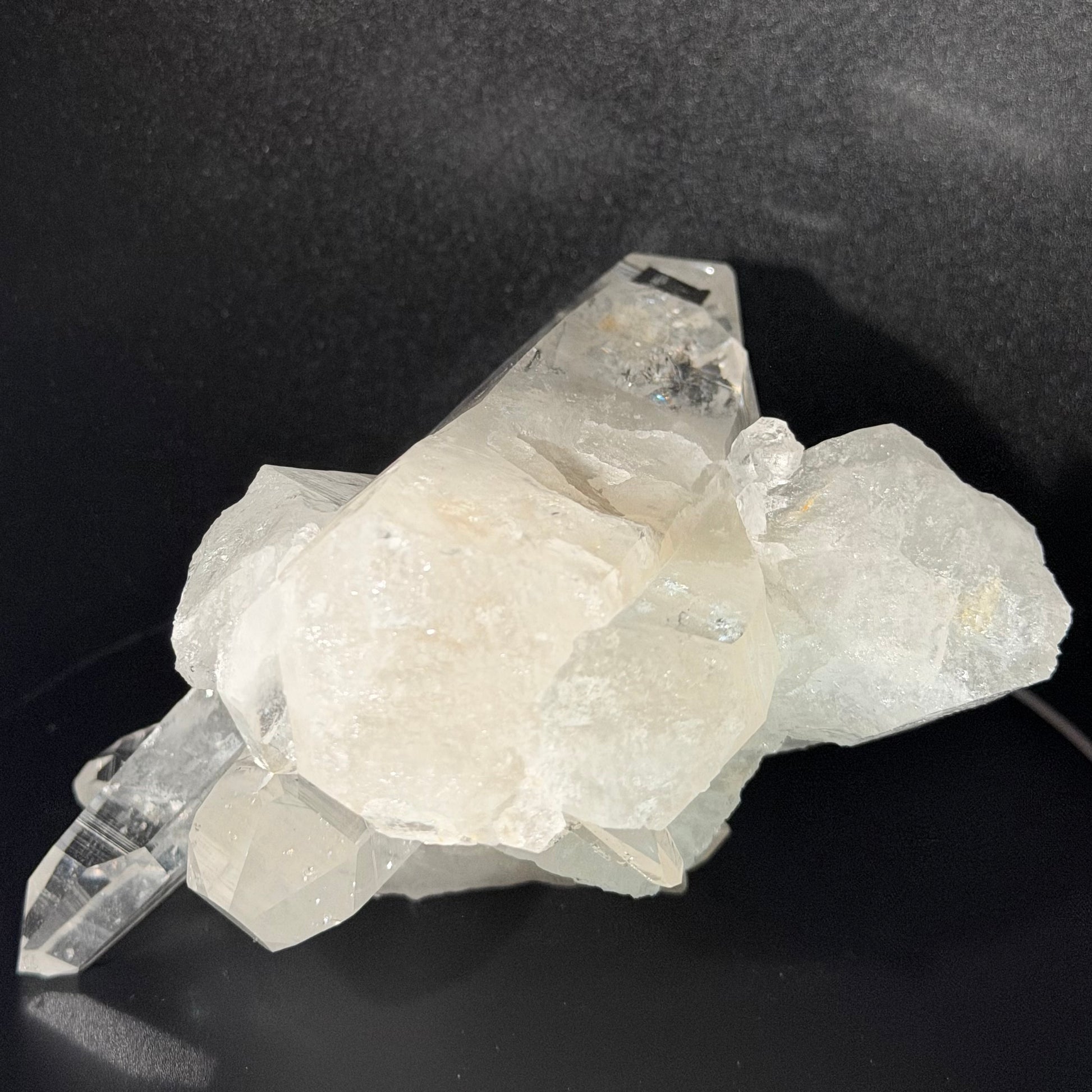 奇跡のコントラスト 突き抜けるようにクリアなレムリアン・ポイントを支えるのは、カルサイトやドロマイトを含む雪のようなミルキークォーツの母岩。 「天の透明感」と「地の安定感」が同居するその姿は、まさに自然が生み出した奇跡の彫刻作品です。