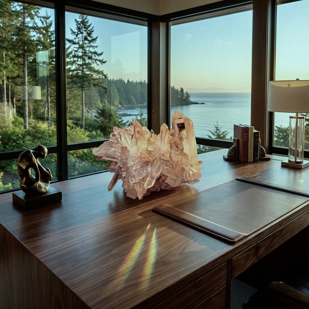 空間を支配する、聖なるアンカー 透明度の高い太いポイントが林立する姿は、まさに水晶の王城。 リーダーの決断を支える書斎のセンターピースとして、あるいは人々を癒やすリトリートの守護石として。この石が一つあるだけで、その空間は強力なパワースポットへと変貌します。
